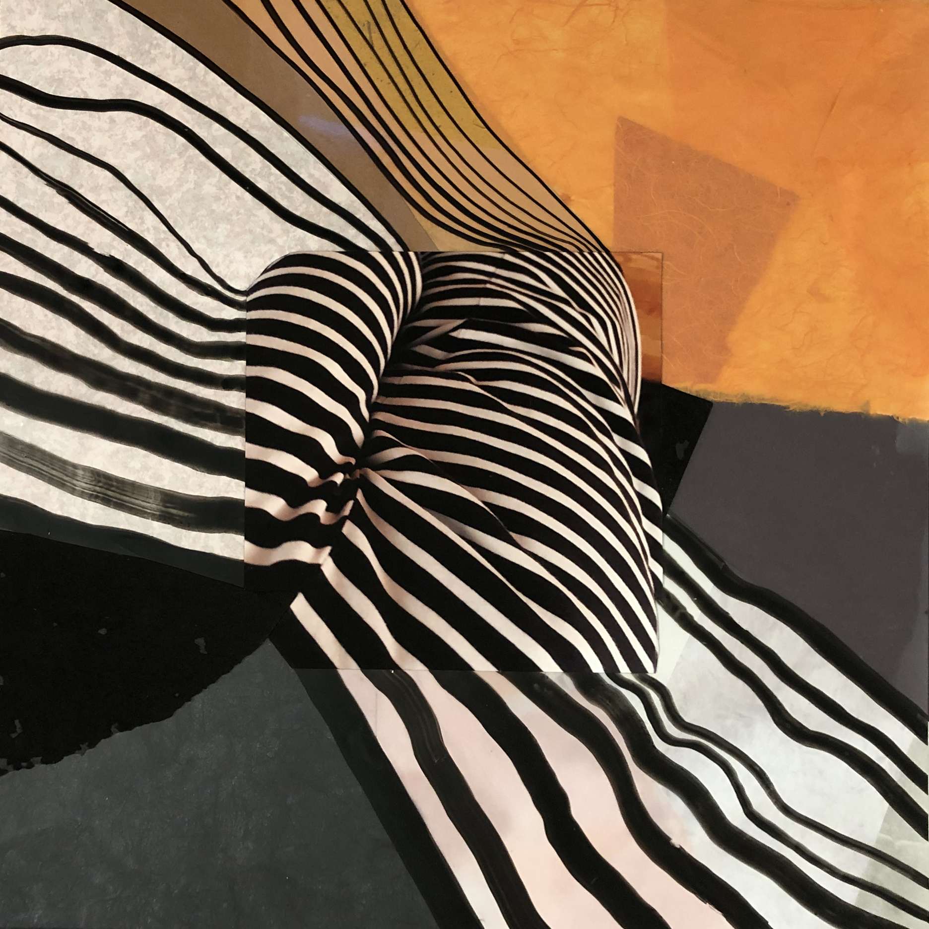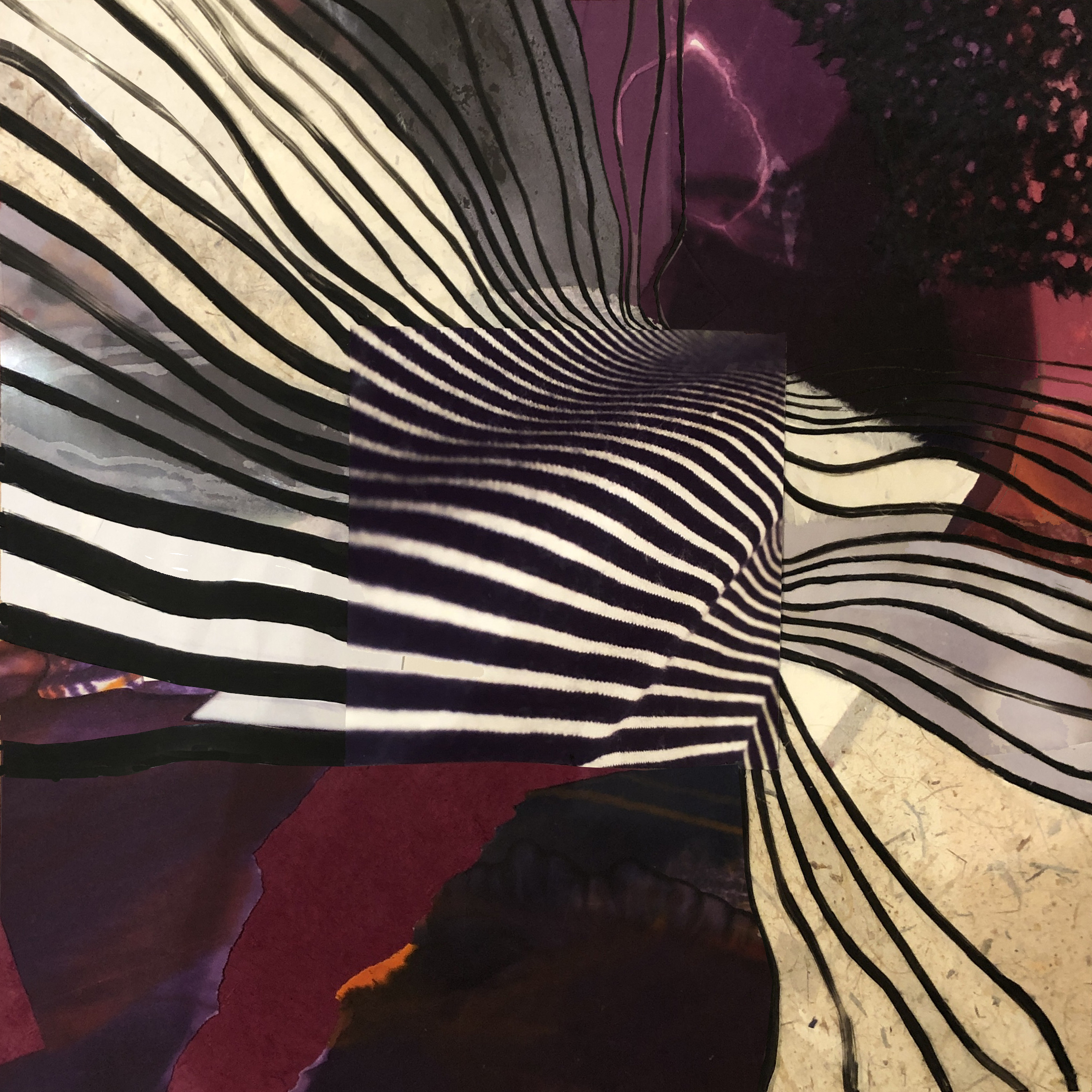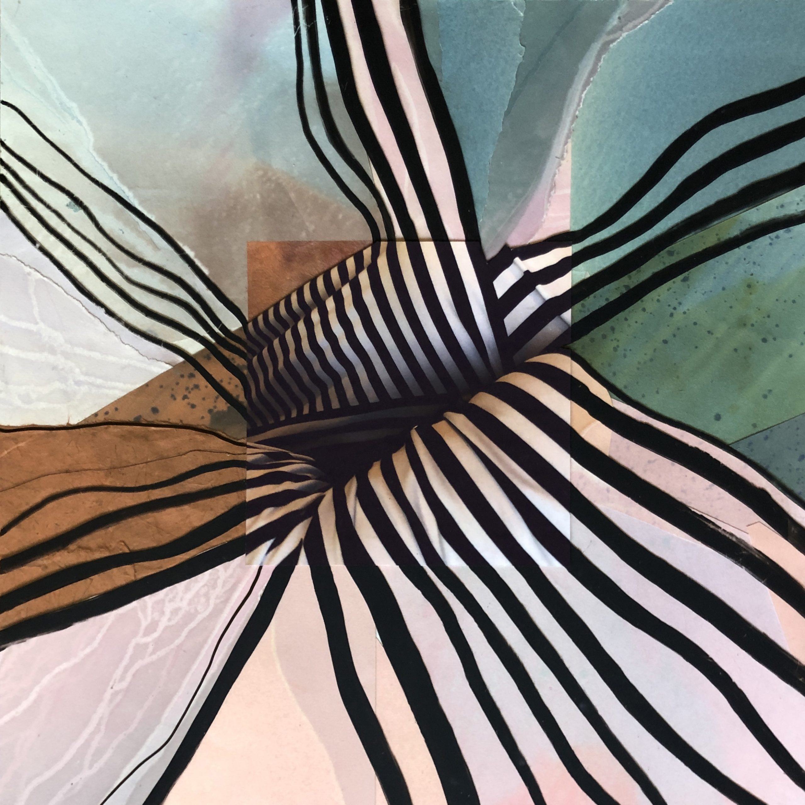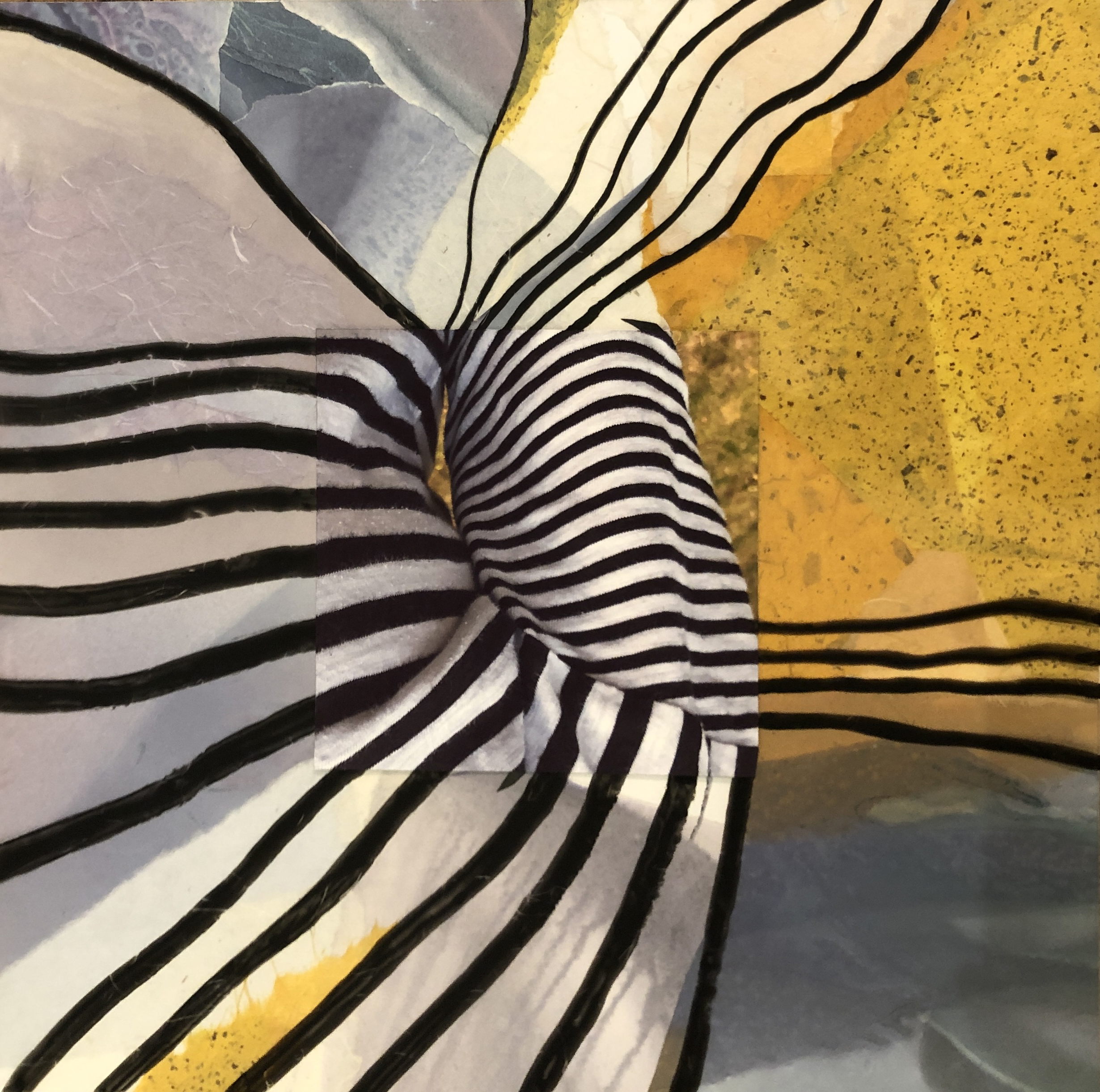 The Inked Growth Series are abstract collages, each composed starting with a cropped detail (8” x 8”) of my photograph of a person wearing striped clothing. I place the square photo in the exact center of the composition, and then continue its stripes with hand drawn India ink or acrylic lines on mylar. I collage my alcohol ink papers along with Asian papers beneath the transparent mylar surface to reflect and extend the central image.