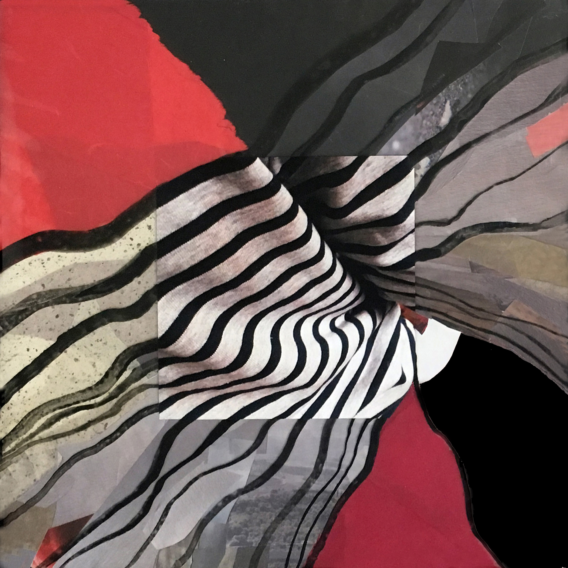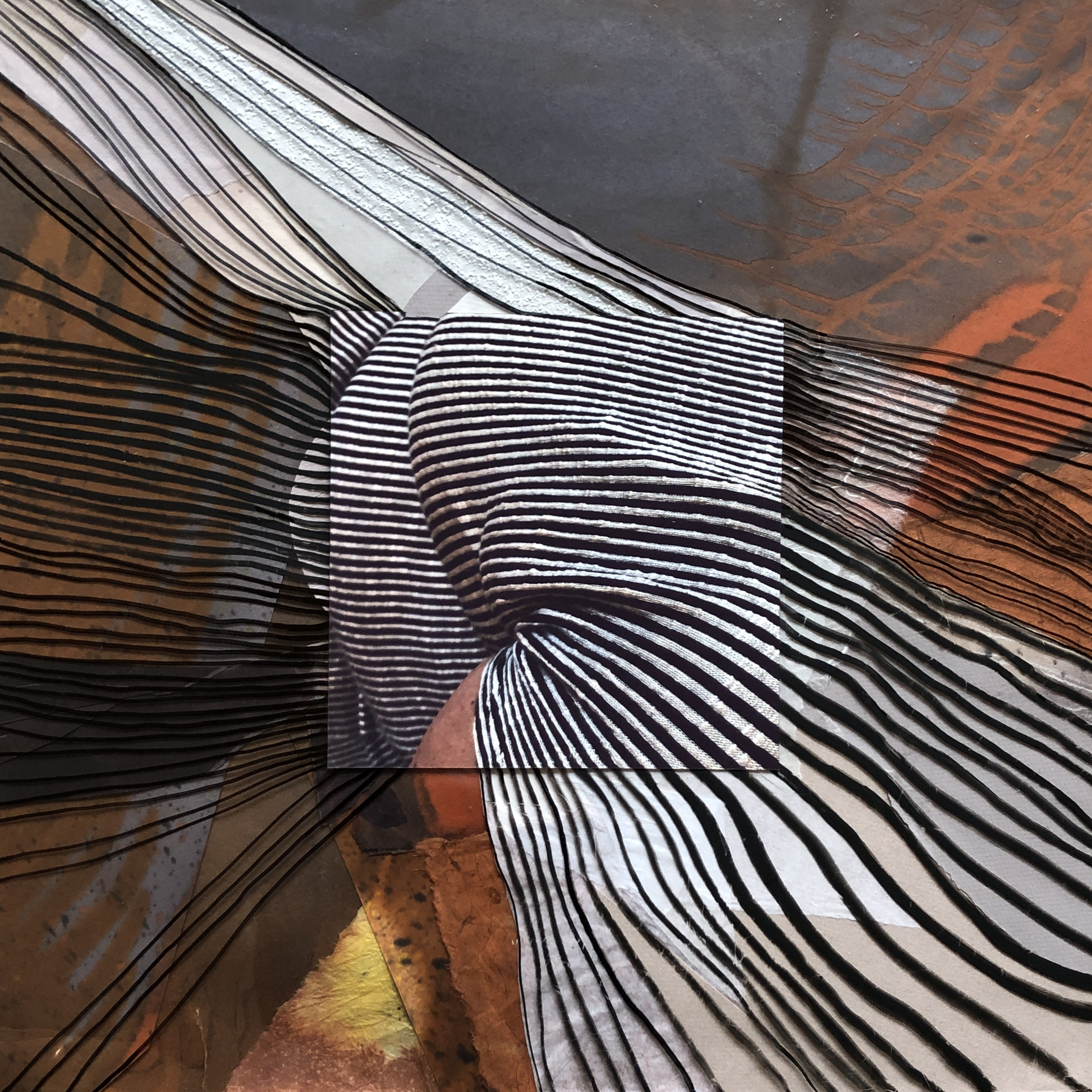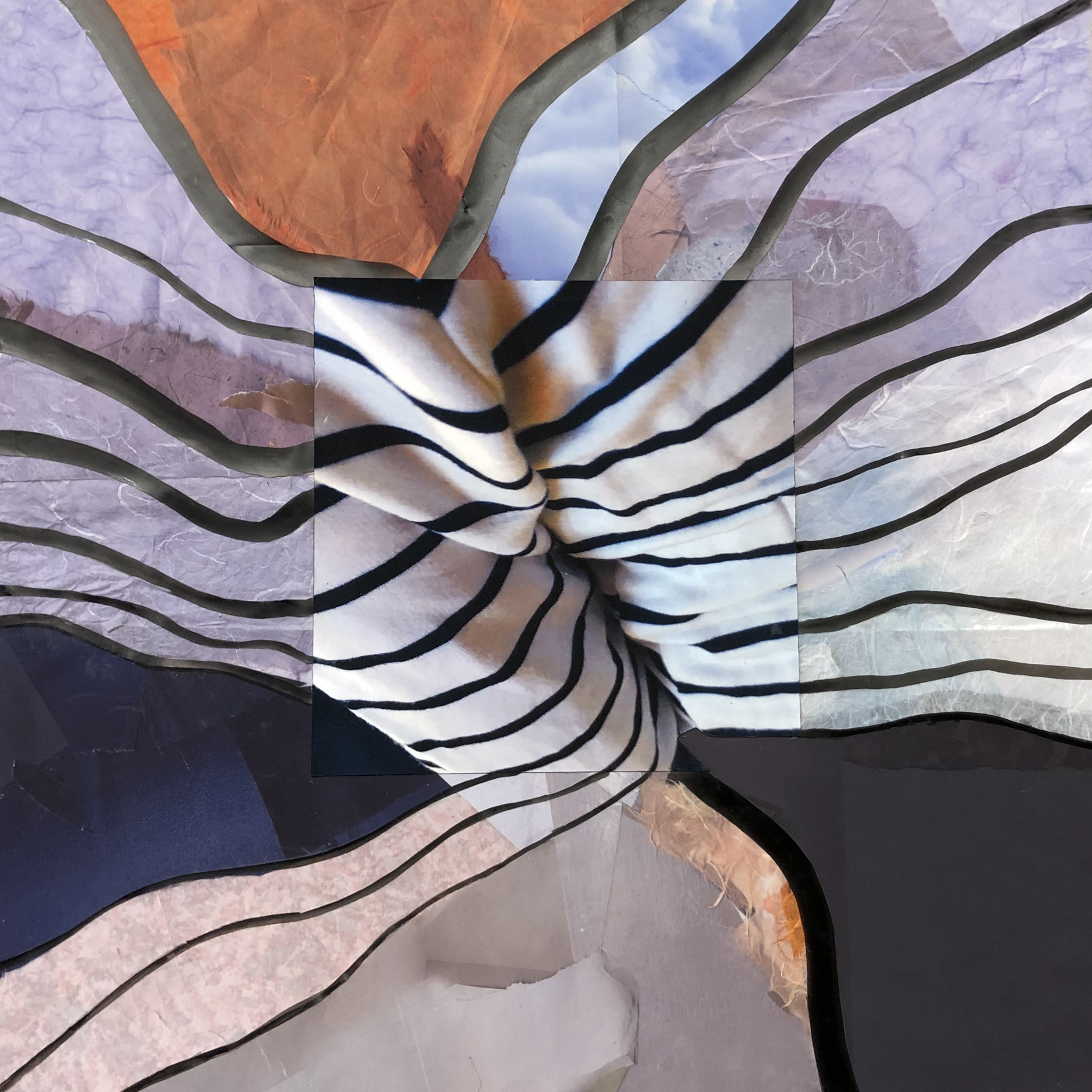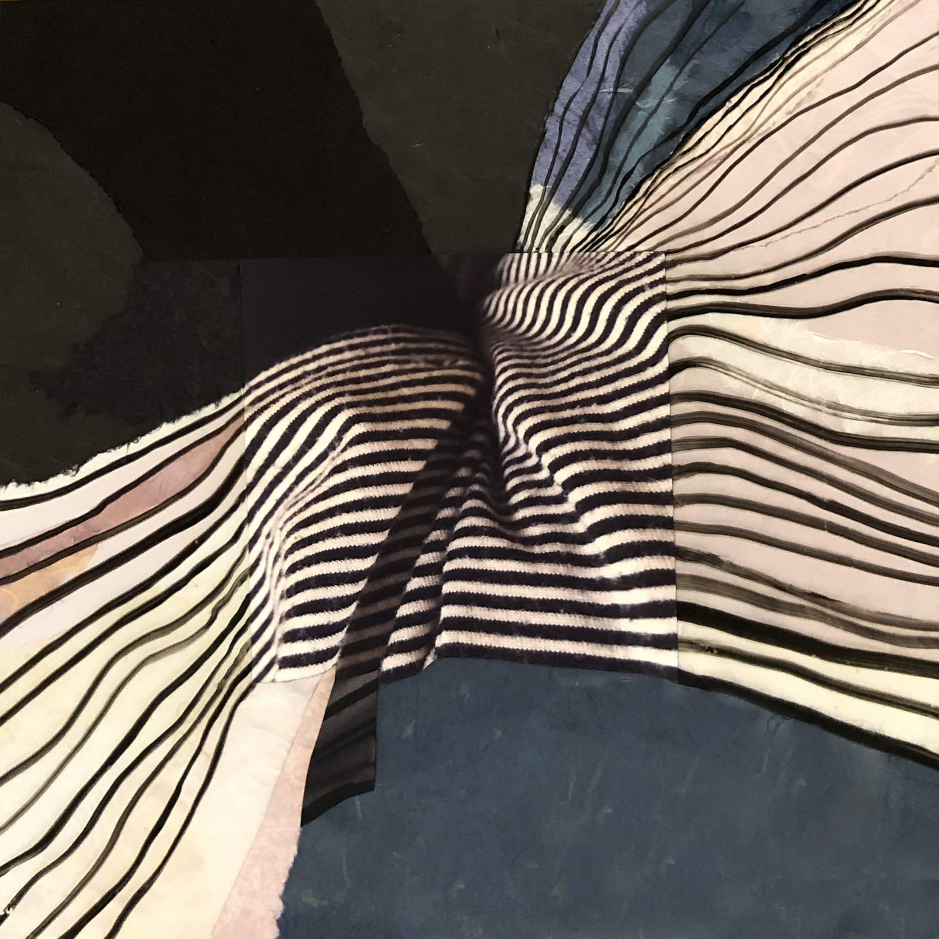 The Inked Growth Series are abstract collages, each composed starting with a cropped detail (8” x 8”) of my photograph of a person wearing striped clothing. I place the square photo in the exact center of the composition, and then continue its stripes with hand drawn India ink or acrylic lines on mylar. I collage my alcohol ink papers along with Asian papers beneath the transparent mylar surface to reflect and extend the central image.
